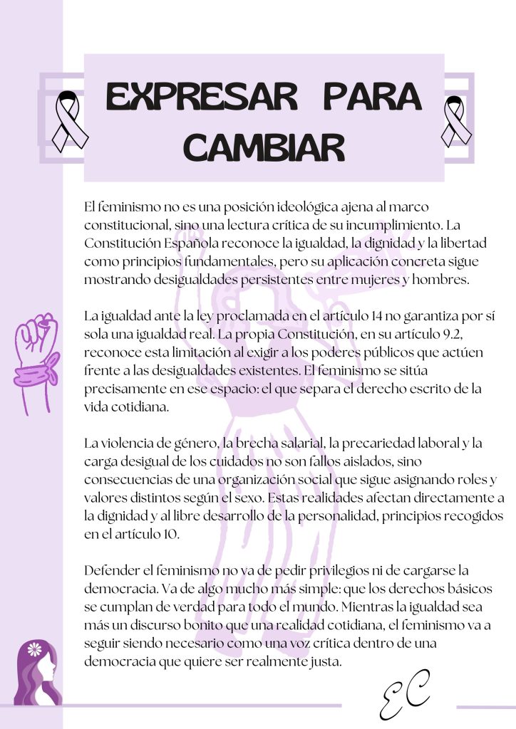 ​Bajo los lemas «Expresar para cambiar» y «La igualdad no es un privilegio», los estudiantes han realizado una lectura crítica y constructiva de nuestra Constitución Española. A través de sus materiales, demuestran cómo la igualdad real y la dignidad de la persona requieren de un compromiso activo para superar brechas y estereotipos persistentes.
